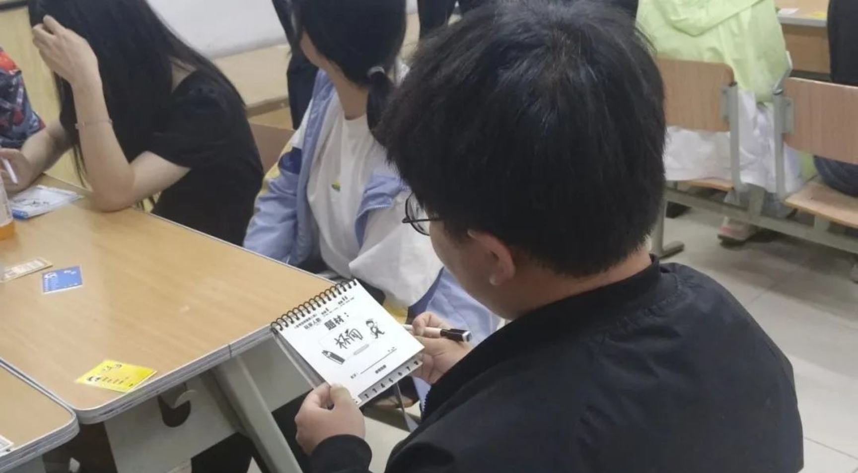 破冰的最后一个小游戏是画笔传情:同学们坐成一圈,通过不断的绘画与猜测,来传递第一个人的答案,看看最后一个人是否能准确猜出第一个选择的词语。